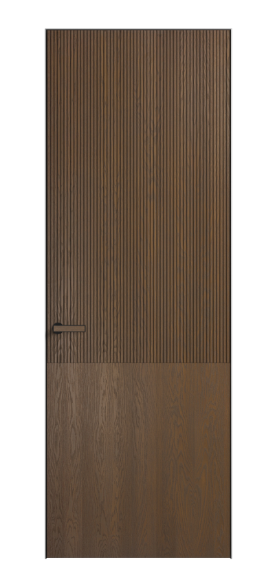 Это полотна с рельефной фрезеровкой. Этот прием делает интерьер объемным, тактильным, вносит интересную текстуру и создает современный образ. Волнистый рельеф может быть выполнен по ламелям из массива дуба в древесных матовых отделках, либо исполнен по натуральному и экологически безопасному материалу — ХДФ, покрытому гладкой эмалью актуальных оттенков.